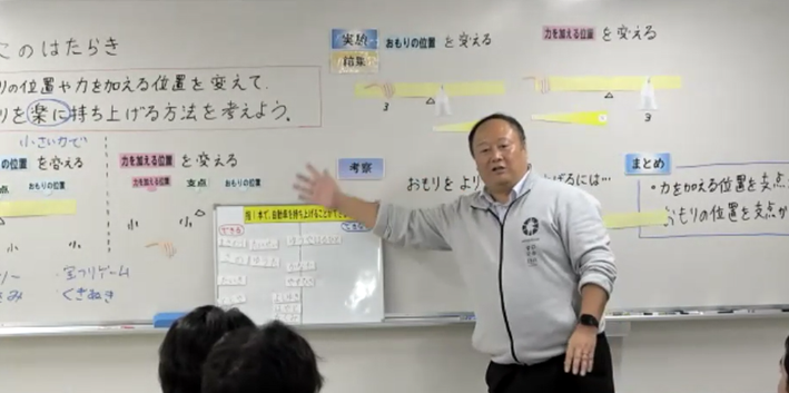 目標:おもりの位置と力を加える位置を変えて調べる活動を通して、おもりの位置を支点に近づけ、力を加える位置を支点から遠ざけると楽に持ち上がることに気付き、「おもりの位置」「支点」「力を加える位置」という言葉と図を使ってまとめることができる。【思考・判断・表現】